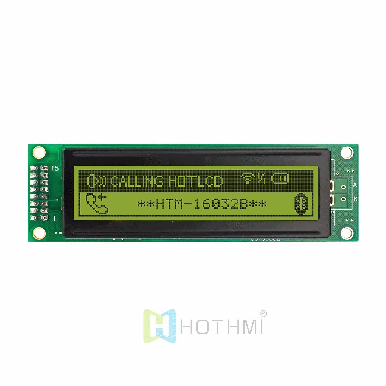 The 3.4" 160x32LCD Graphic Dot Matrix Module displays deep black pixels on a bright yellow-green background. This transflective LCD display is engineered to provide optimal visibility in a variety of lighting conditions in many different environments. In bright sunlight, the display uses its reflective layer to reflect ambient light back to the viewer, making the screen easy to read. In darker environments, the LCD has a strong built-in backlight that provides high contrast and displays clear graphics to the viewer. This advanced display technology ensures that the display is always easy to read regardless of the lighting conditions.