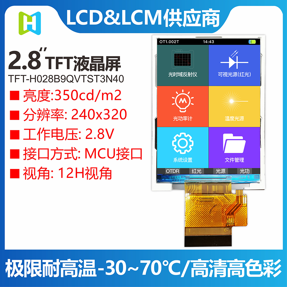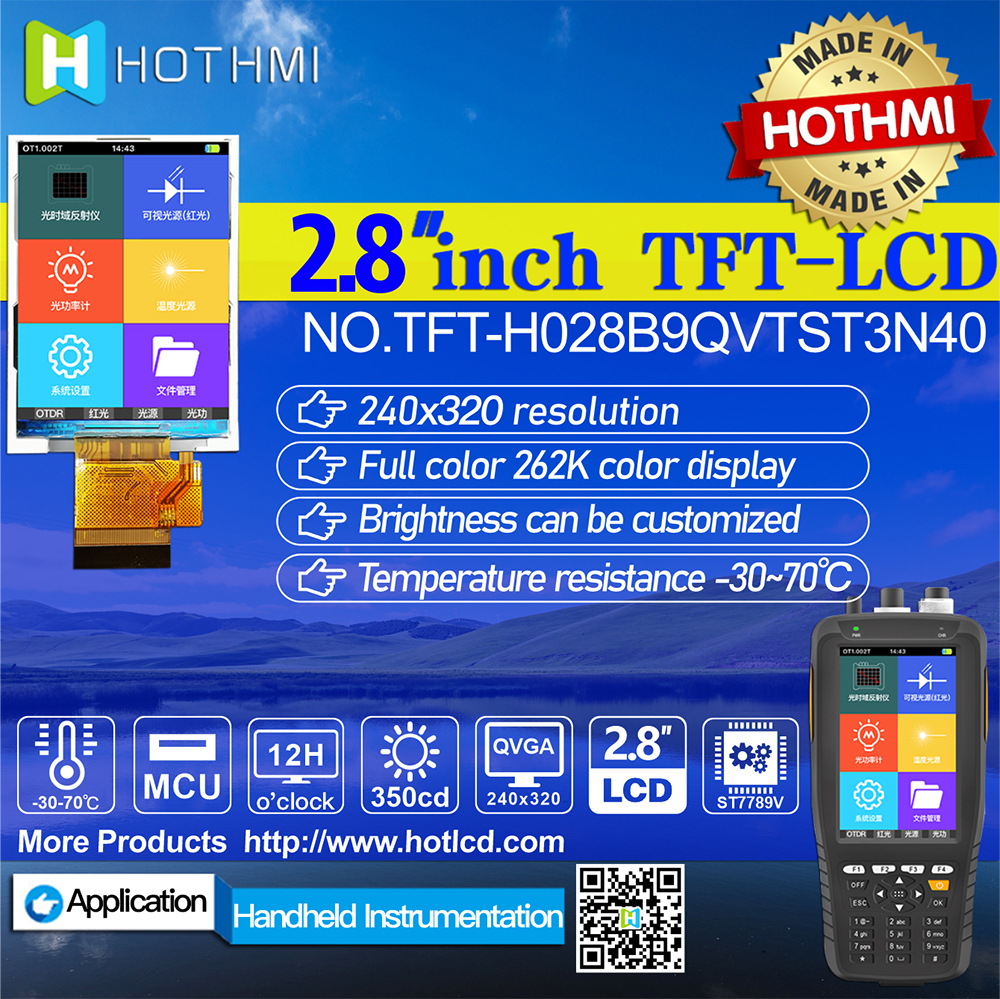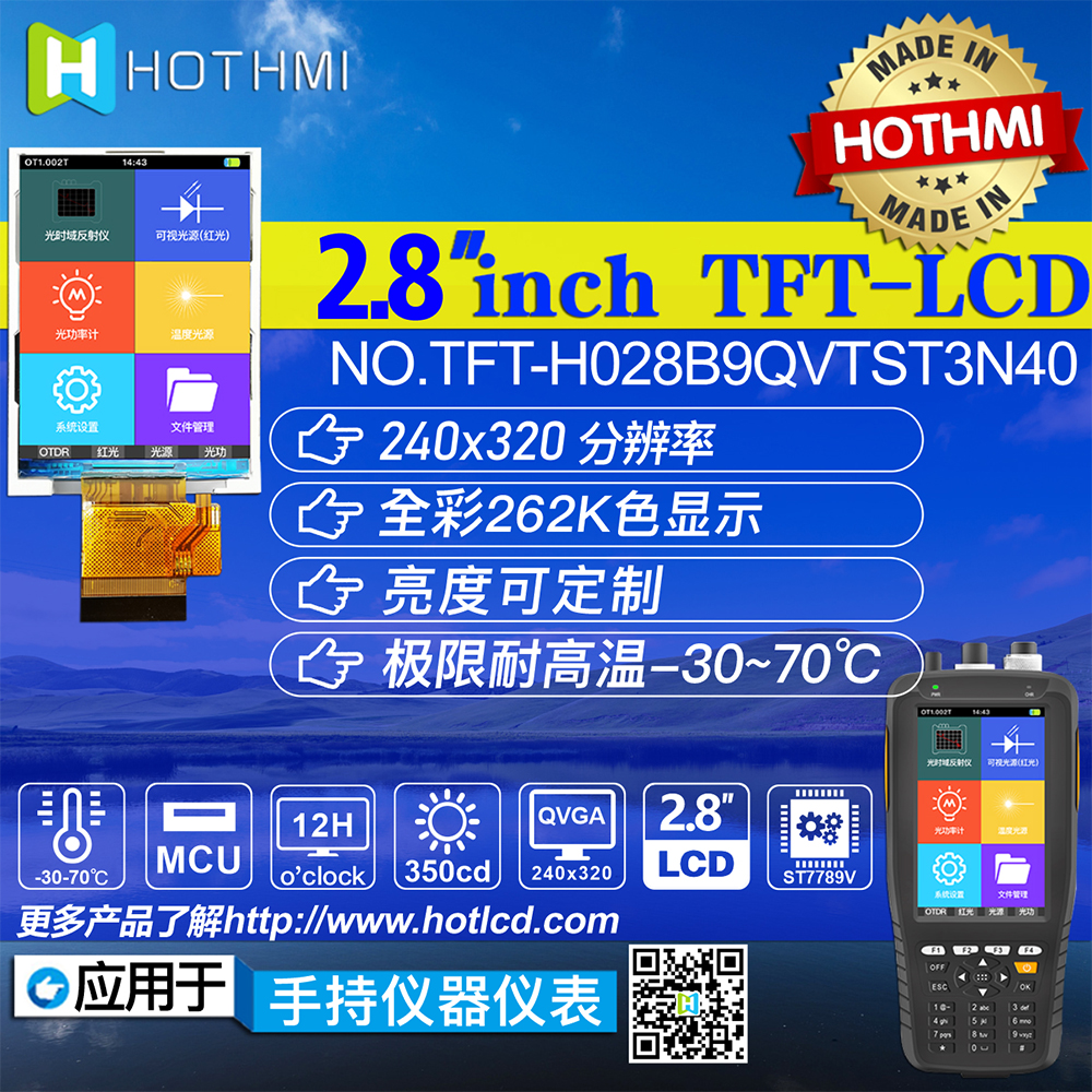 TFT-H028B9QVTST3N40 is a 2.8-inch TFT color LCD screen carefully designed by HOTLCD R&D team, 240*320 resolution, high image quality, wide viewing angle, 65K/262K true color, built-in ST7789V controller, support MCU interface, 40PIN external FPC can be connected Mainboard (optional connector), single power supply DC 2.8V power supply. The TFT module can be equipped with a touch screen and all materials are RoHS compliant. Widely used in various instruments, smart devices, analytical instruments, handheld instruments, driving recorders, etc.: 8051, PIC, AVR, ARDUINO, ARM, Raspberry Pi, etc.