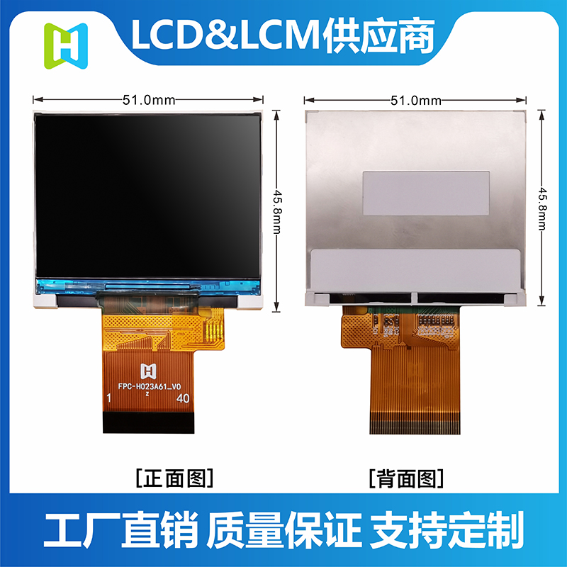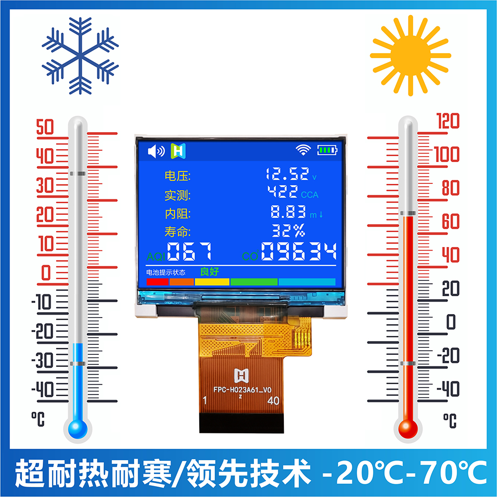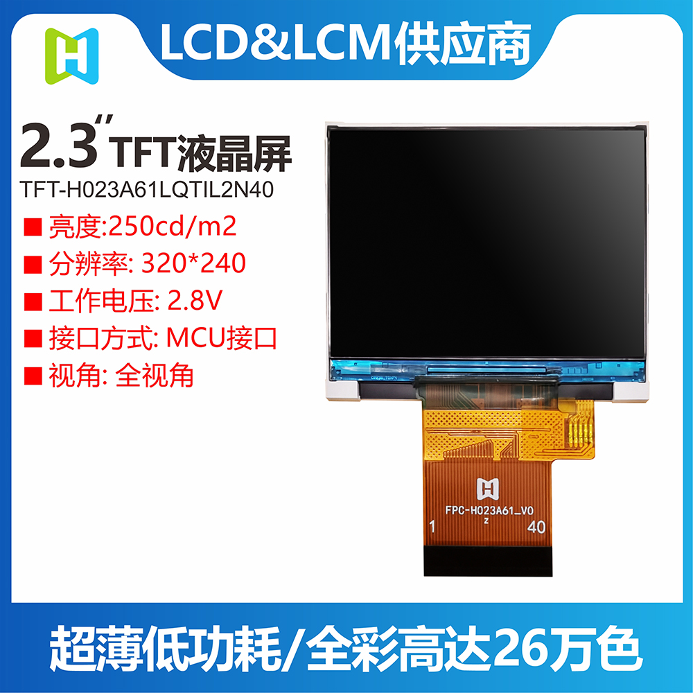 TFT-H023A61LQTIL2N40is an industrial-grade horizontal display TFT LCD with a resolution of 320*240 pixels, a typical brightness of 400 nits, a viewing angle of 12H, and a supply voltage (VCI) of 2.8V~3.2V , the typical value is 2.8V. The working temperature is -20℃~+70℃, and the storage temperature is -30℃~+80℃. The products are used in various small smart devices, home appliances, monitors, etc.