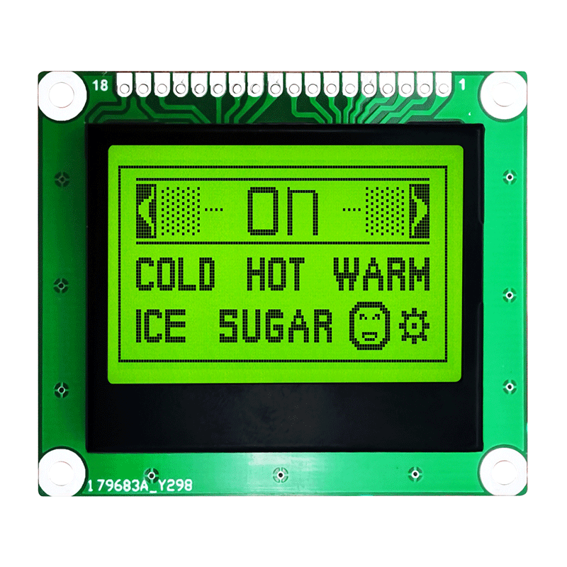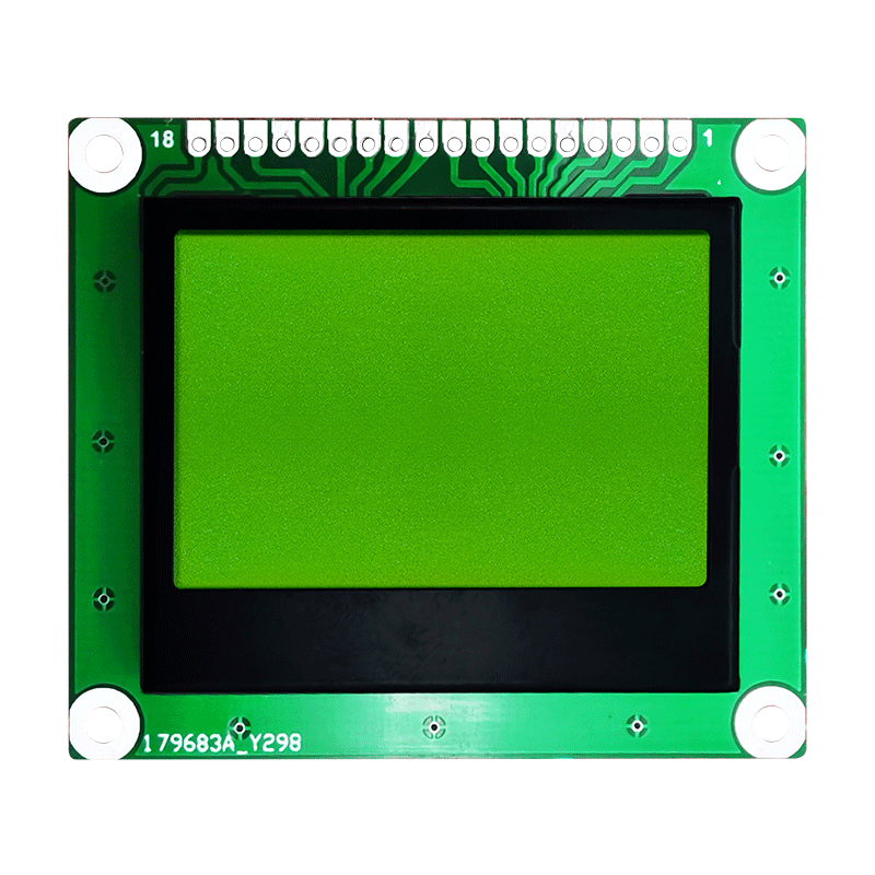 HOTLCD 128x64 graphic Chip-On-Glass (COG) Liquid Crystal Display shows blue pixels on a gray background. This transflective LCD Display is visible with ambient light or a backlight while offering a wide operating temperature range from -20 to 70 degrees Celsius. This HTM-COG12864C01A-MCU8080 display has an optimal view of 6:00, operates at 3.3V supply voltage and is RoHS compliant.