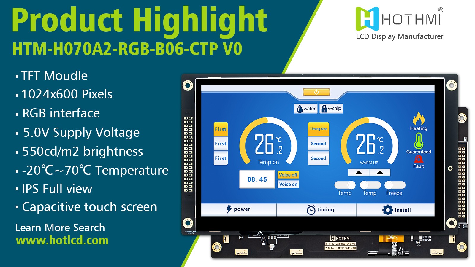 • Model : 7 Inch Capacitive Touch IPS 1024x600 TFT LCD Module Display Panel With Controller Board HTM-H070A2-RGB-B06