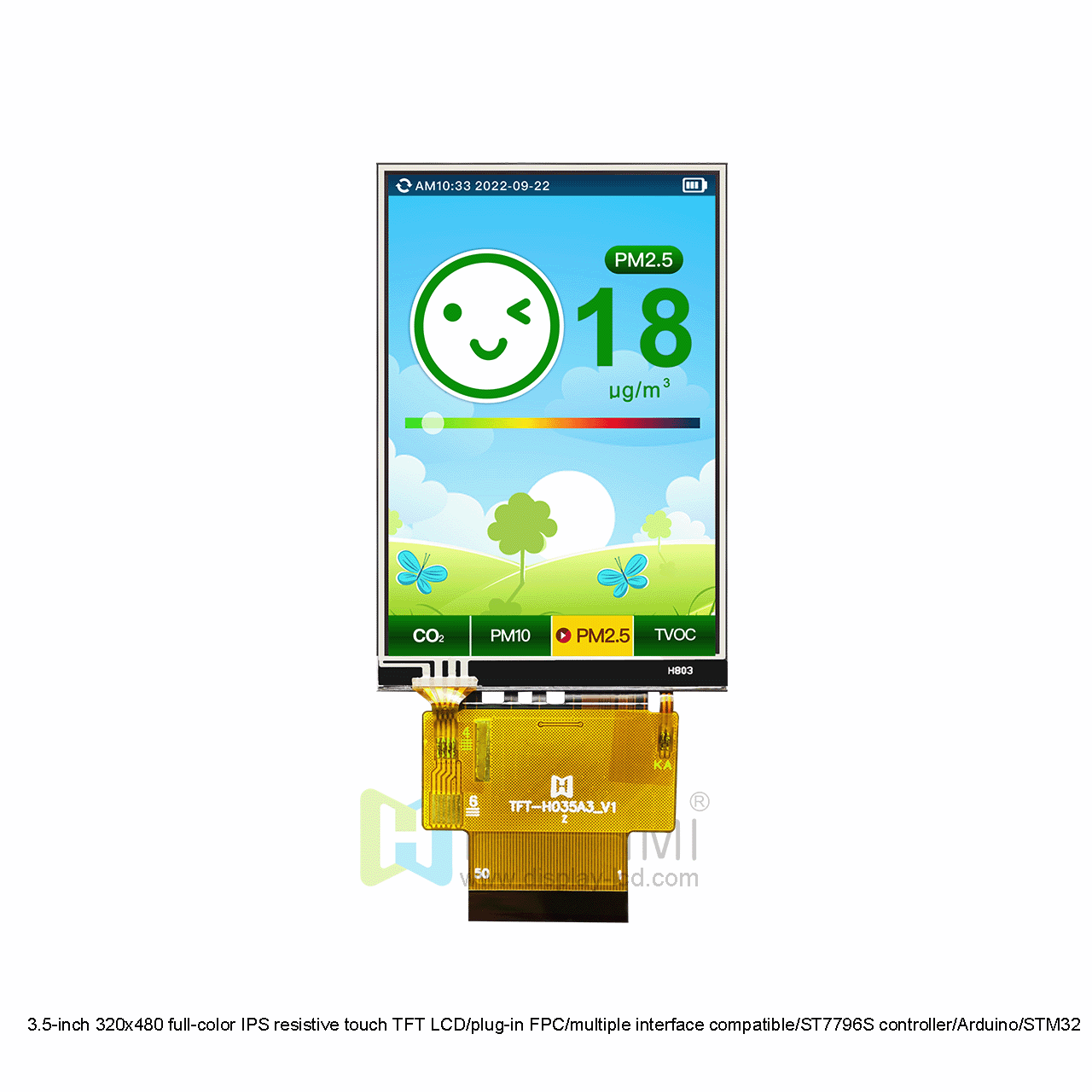 This TFT-H035A3HVIST4R50 3.5-inch TFT display is very powerful. It has a brightness of 450 nits, a contrast ratio of 800:1, and a pixel of 320x480, and the detailed image is clear and sharp. Powered by a 3.3V power supply, it provides amazing clarity, excellent color reproduction, better image consistency, and high contrast at all viewing angles due to the built-in IPS technology. Compatible with multiple interfaces, you can choose SPI, MCU, SPI+RGB interface. This interface configuration makes this display compatible with various Arduino models and other similar circuit boards, so that it can be seamlessly integrated with Arduino projects. This display also has a 50-pin FPC, a 0.5mm pitch connection method, and is powered by an ST7796S controller. This model is equipped with a high-sensitivity resistive touch function, with a high appearance and good quality.