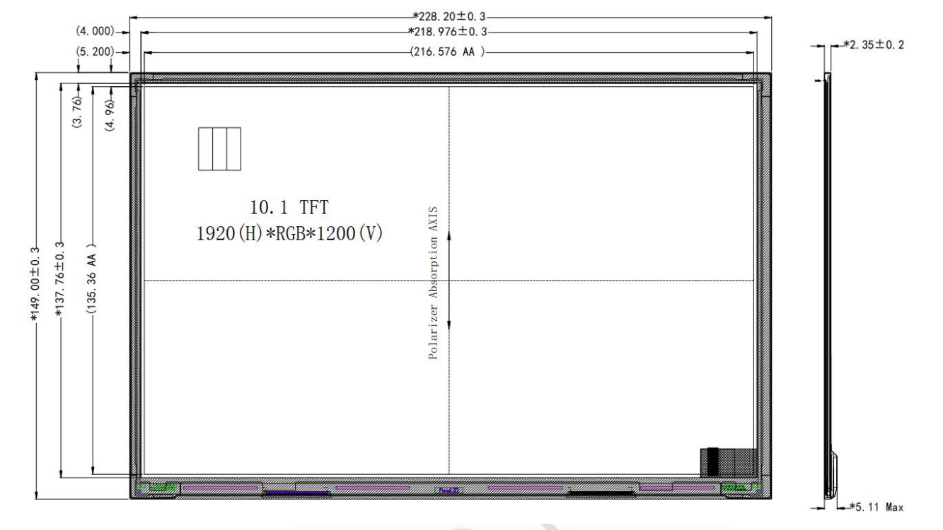 228.2x149x2.35 | 10.1 | 10.1 | 216.576x135.36 | IPS | 1000cd/m2 | FFC-30 pin | eDP | Anti-static ESD 8KV | -20~70℃ | +3.3V | ||