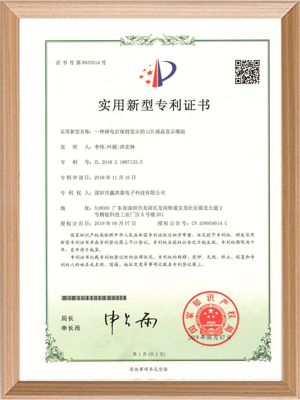 實用新型專利證書
