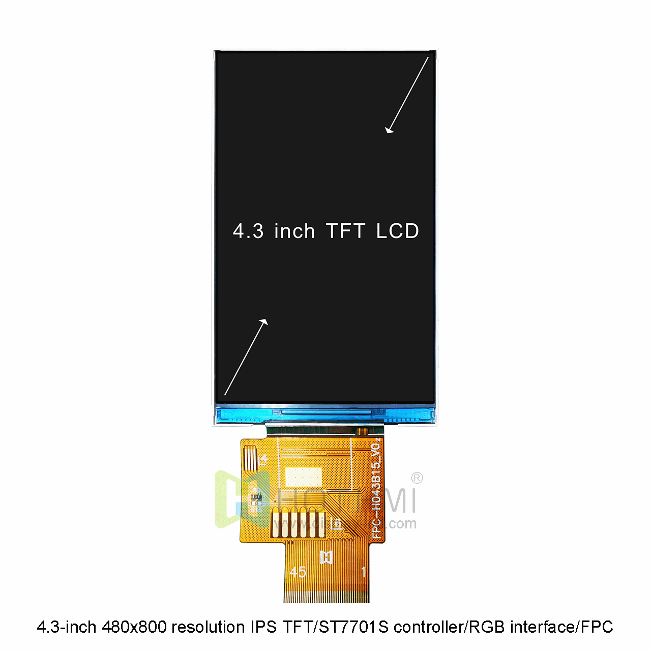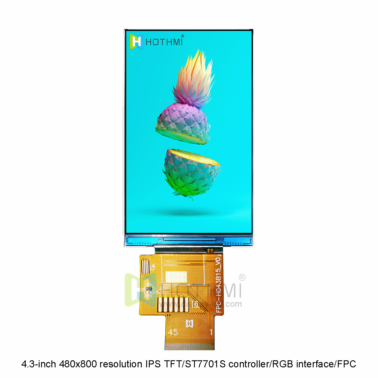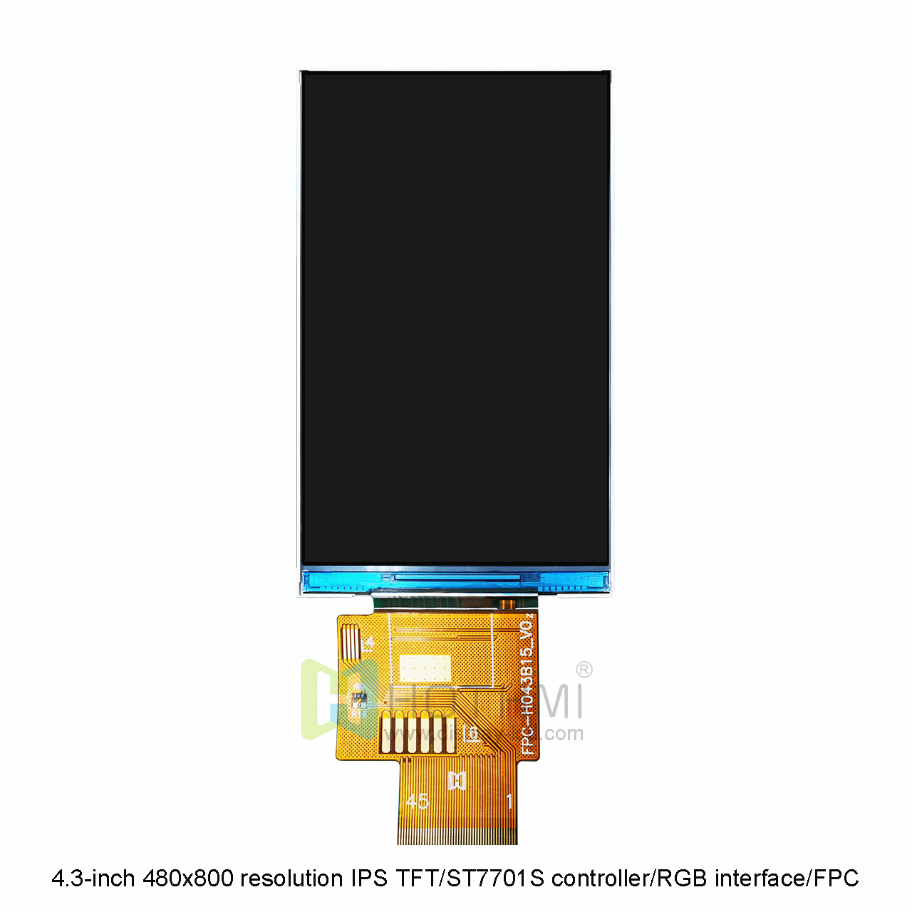 4.3英寸480x800分辨率IPS寬溫TFT/ST7701S控制器/RGB接口/FPC插接/STM32/RK TFT-H043B15WVIST4N45這款顯示屏是一款全視角顯示屏,不管你從哪個(gè)角度觀賞,都有良好的觀賞效果。由ST7701S控制,屬于寬溫工業(yè)級(jí)顯示屏,工作溫度范圍為-20攝氏度至+70攝氏度。這款型號(hào)是采用FPC的連接方式,F(xiàn)PC需連接器。只需用我們的可選焊接 FPC 連接器進(jìn)行連接,易于插入或移除。此款顯示屏它的亮度為 450cd/m2。如果您需要更高的亮度,我們可以通過(guò)調(diào)整背光的排列和數(shù)量為您實(shí)現(xiàn)。這款型號(hào)是不帶觸摸版本,同款產(chǎn)品我們還提供帶電容觸摸的型號(hào)。