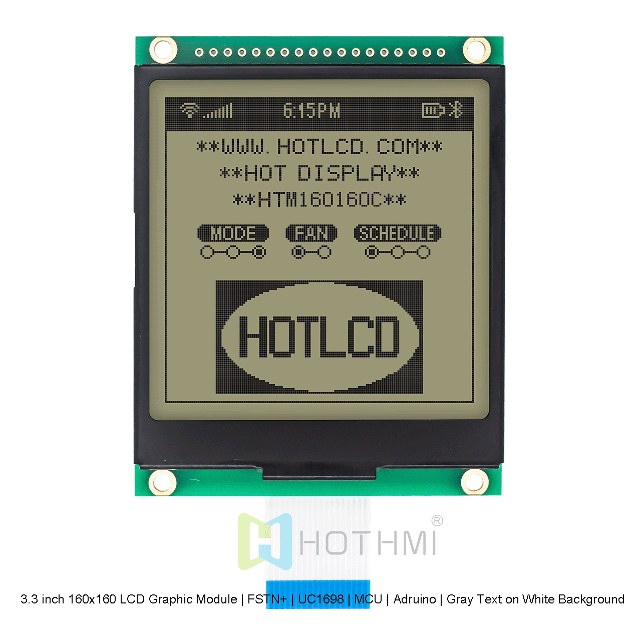3.3 英寸 160x160 LCD 圖形模塊在白色背景上顯示深灰像素。這款透射式 LCD 顯示屏經(jīng)過精心設(shè)計,可在較暗的環(huán)境下使用時提供最佳的可視性和令人印象深刻的色彩。顯示屏內(nèi)置強(qiáng)背光,可提供高對比度并確保屏幕上所有圖形的易讀性。