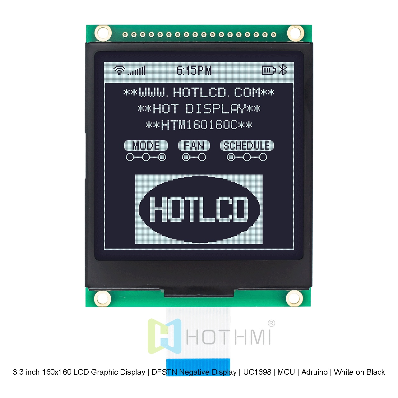 3.3 英寸 160x160 LCD 圖形顯示屏在黑色背景上顯示白色像素。這款全透式 LCD 顯示屏經(jīng)過精心設計,在明亮環(huán)境中,通過偏光片的反射性,將圖像反射給觀賞者,在較暗的環(huán)境中,LCD 內(nèi)置強背光,可提供高對比度并向觀看者顯示清晰的圖形。這種先進的顯示技術(shù)可確保顯示屏始終易于閱讀,無論照明條件如何。