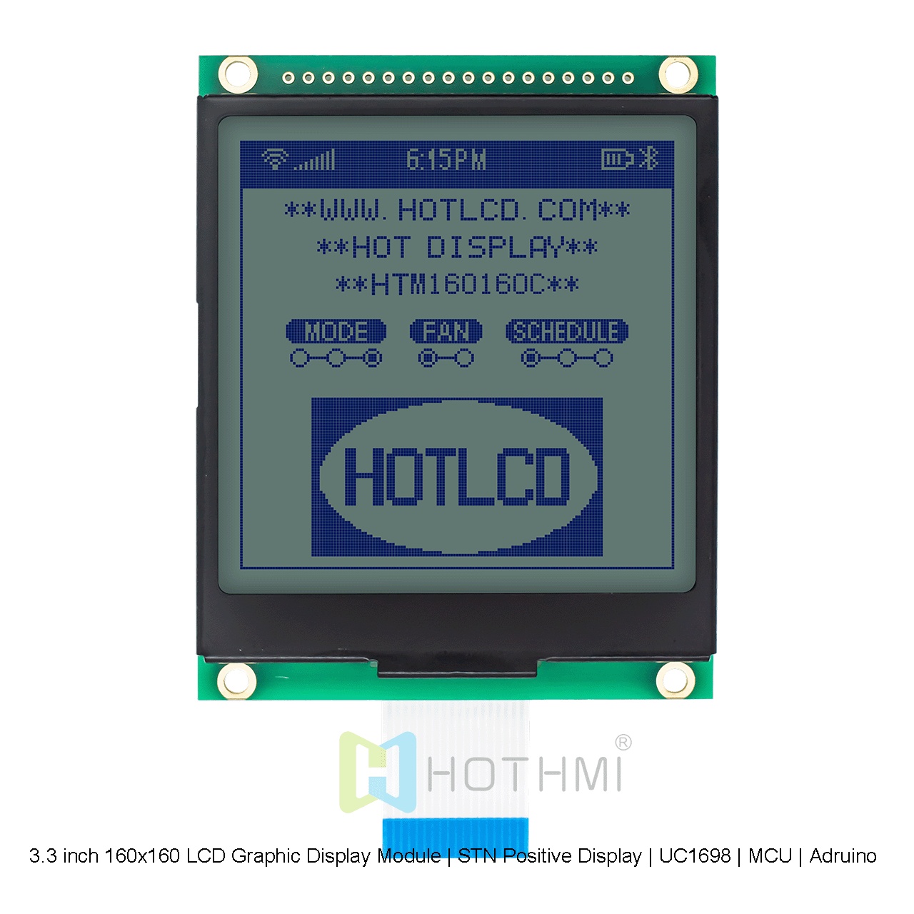 3.3 英寸 160x160 LCD 圖形顯示屏在灰色背景上顯示藍(lán)色像素。這款全透式 LCD 顯示屏經(jīng)過精心設(shè)計,在明亮環(huán)境中,通過偏光片的反射性,將圖像反射給觀賞者,在較暗的環(huán)境中,LCD 內(nèi)置強(qiáng)背光,可提供高對比度并向觀看者顯示清晰的圖形。這種先進(jìn)的顯示技術(shù)可確保顯示屏始終易于閱讀,無論照明條件如何。