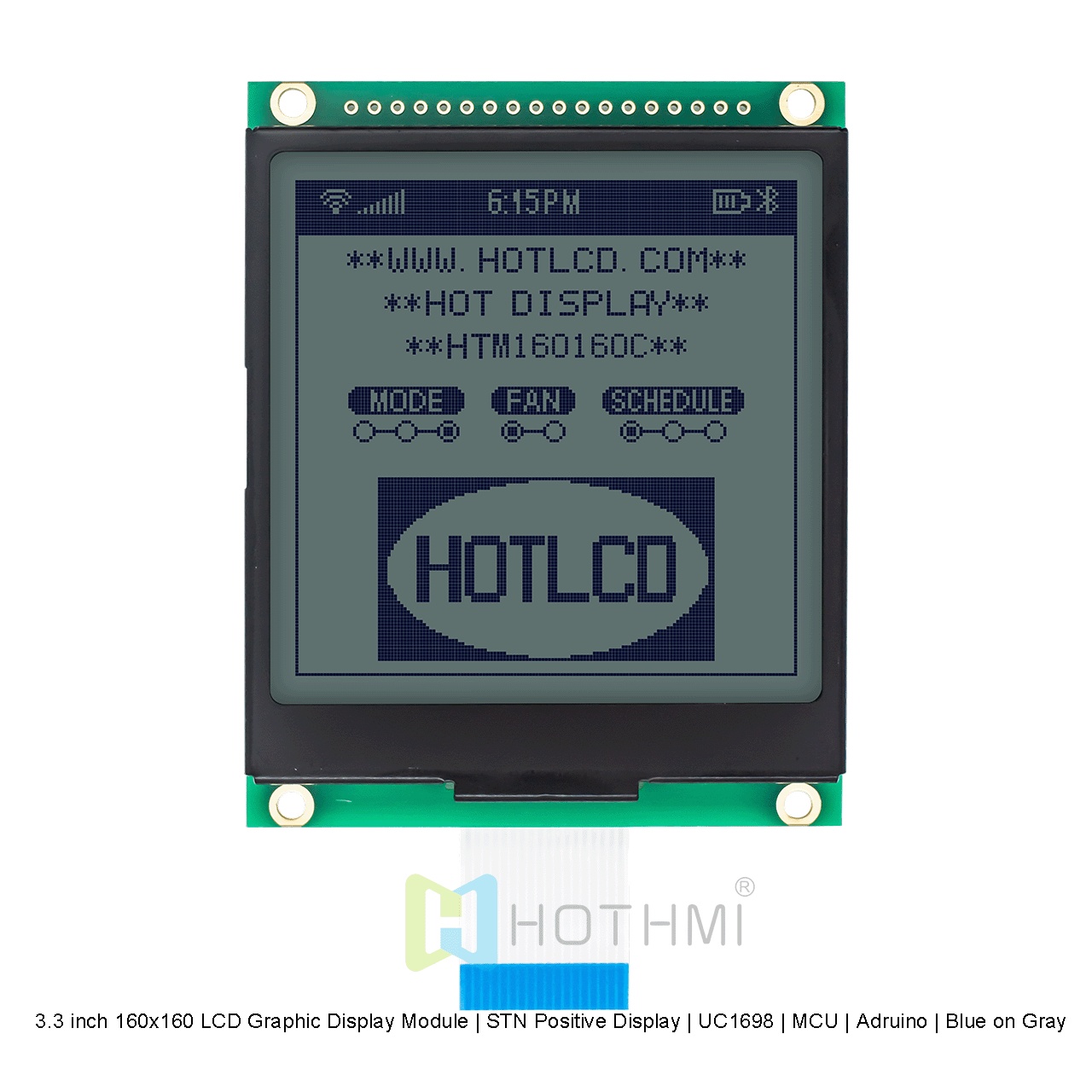 3.3 英寸 160x160 LCD 圖形顯示屏在灰色背景上顯示藍色像素。這款全透式 LCD 顯示屏經(jīng)過精心設計,在明亮環(huán)境中,通過偏光片的反射性,將圖像反射給觀賞者,在較暗的環(huán)境中,LCD 內(nèi)置強背光,可提供高對比度并向觀看者顯示清晰的圖形。這種先進的顯示技術(shù)可確保顯示屏始終易于閱讀,無論照明條件如何。