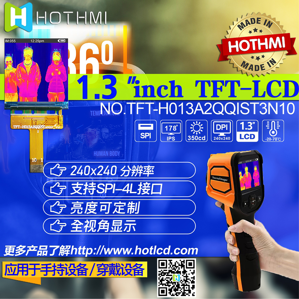 這款1.3寸TFT彩屏,非常適用于手持式紅外測(cè)溫槍顯示屏(紅外測(cè)溫儀顯示屏),支持SPI接口,具有尺寸方正、結(jié)構(gòu)緊湊、高亮度、全視角、色彩豐富的特點(diǎn),顯示數(shù)據(jù)一目了然。