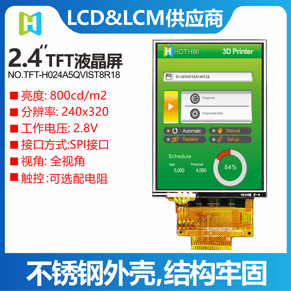產(chǎn)品描述 TFT-H024A5QVTST8R18 是一款 2.4 英寸寬溫 IPS TFT-LCD 顯示器,帶有投射電阻式觸摸屏,分辨率為 240x320 像素。 模塊內(nèi)置ST7789V驅(qū)動IC,支持SPI接口。 TFT-H024A5QVTST8R18采用IPS面板,具有視角更廣的優(yōu)勢,左:80/右:80/上:80/下:80度(典型),對比度800:1(典型),亮度800尼特(典型) ) 值),眩光面板,16:9 縱橫比。 H024A5 型號具有投射電阻式觸控面板 (PCAP), TFT-H024A5QVTST8R18的供電電壓(VCC)為3.0V至3.6V,典型值為3.3V。 它可以在 -30°C 到 +80°C 的溫度和 -30°C 到 +80°C 的存儲溫度下工作。