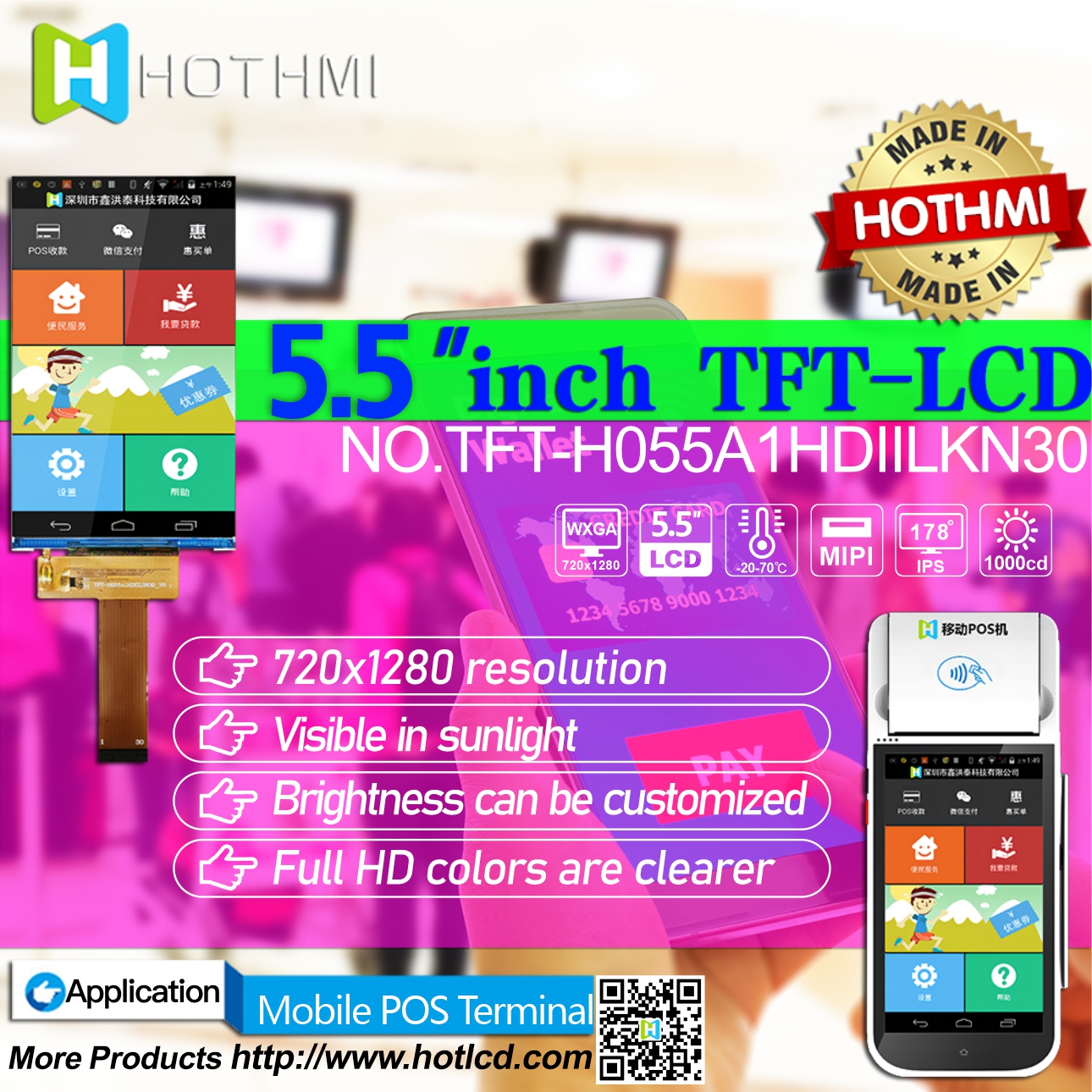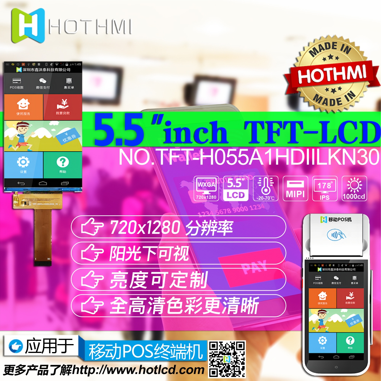 TFT-H055A1HDIIL3N30為5.5吋720 x1280全彩HD高畫質的TFT LCD模塊。此款TFT-LCD支持MIPI DSI接口,采用廣視角IPS(In-plane Switching)面板技術,視角范圍為左: 80 / 右: 80 / 上: 80 / 下: 80 度,IPS面板視角廣度廣,色彩鮮明、具有飽和自然的優(yōu)質畫面。此型號工作溫度為-20℃ 至+70℃,儲存溫度–30℃ 至 +80℃。