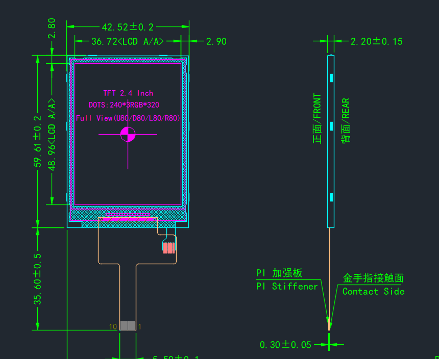 TFT-H024A16QVIST6N10是一款2.4英寸微型TFT顯示模組,分辨率為240x320像素。 該微型液晶顯示模塊內(nèi)置ST7789 IC; 支持串行3線/4線SPI接口。 該型號的模塊尺寸為 42.52x59.61 mm,有效區(qū)域尺寸為 36.72x48.96mm; 它的模擬電源電壓范圍為 2.5V 至 3.7V(典型值為 3.3V)。