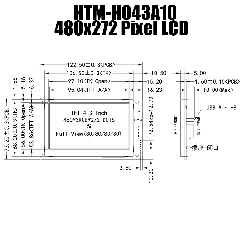 彩色TFT顯示屏尺寸:4.3英寸(對角線)