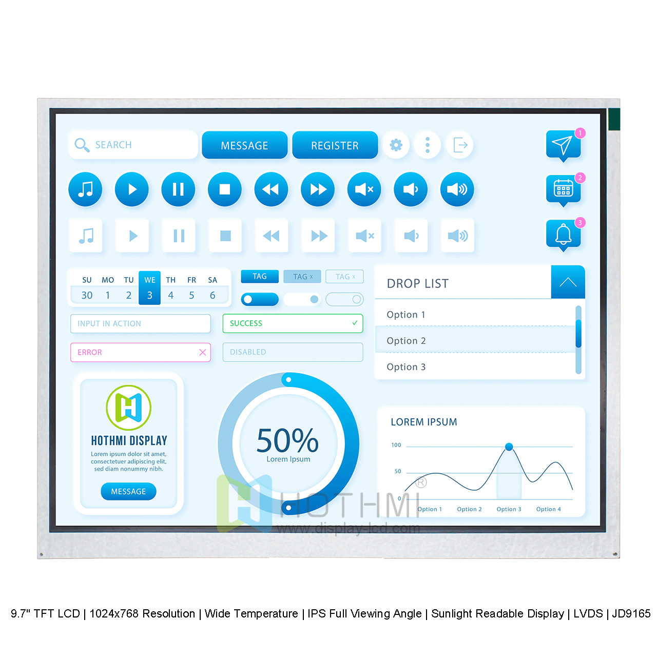 這款 9.7英寸的TFT LCD 分辨率為 1024x768,配備強(qiáng)大的背光,亮度為 500 cd/m2,在明亮的照明條件下(包括直射陽(yáng)光)提供可視性性。該液晶顯示器符合 RoHS 標(biāo)準(zhǔn),并與 Arduino 和其他類似板兼容。 一些行業(yè)和應(yīng)用包括工業(yè)、商業(yè)、控制、PLC、戶外手持設(shè)備、航空、消費(fèi)電子產(chǎn)品、醫(yī)療設(shè)備、汽車儀表板、信息亭、現(xiàn)場(chǎng)工程、農(nóng)業(yè)、戶外運(yùn)動(dòng)設(shè)備等等??刂破鲀?yōu)化了顯示器的功能,確保運(yùn)行流暢并準(zhǔn)確呈現(xiàn)圖像和圖形。