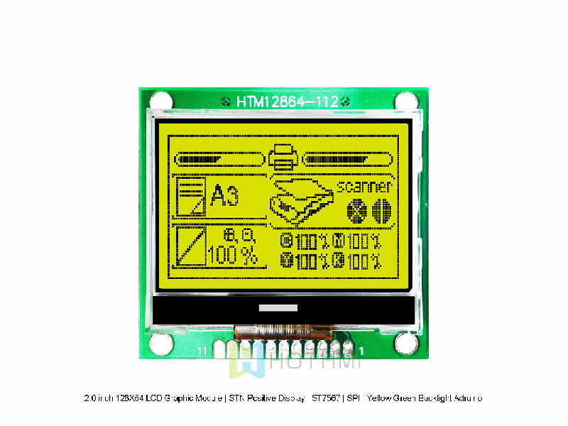 | 2.0 英寸 128X64 LCD 圖形液晶模組 | STN 正顯 | ST7567 | SPI | 黃綠背光 Arduino HTM12864-112-11Y-A5P | 圖形液晶模組 | 128x64 |