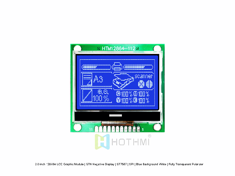 | 2.0 英寸 128X64 LCD 圖形液晶模塊/STN 負(fù)顯/ST7567/SPI /藍(lán)底白字/全透偏光片 HTM12864-112-25W-A5P | 圖形液晶模組 | 128x64 |