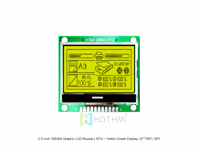 | 2.0 英寸 128X64 圖形 LCD 模塊 | STN + 黃綠顯示屏 | ST7567 | SPI HTM12864-112-01Y-A5P | 圖形液晶模組 | 128x64 |